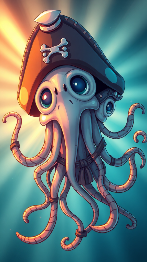 A whimsical anthropomorphic jellyfish pirate character portrait, showcasing a dynamic pose with multiple expressive faces. The scene is illuminated by dramatic backlighting, with light rays filtering through the translucent tentacles. The illustration is rich in detail and features a lively cartoon style. The jellyfish sports a tattered pirate outfit, complete with a jaunty hat and intricately knotted ropes. Swirls of oceanic hues add vibrant contrast, as this vector art, with its stylized distortion, captures the mysterious allure of the sea.
