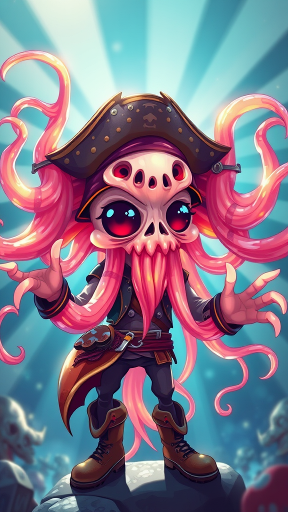 A whimsical anthropomorphic jellyfish pirate with multiple heads, featuring exaggerated cartoon proportions and vibrant colors, striking a dynamic pose in a character portrait design study. The scene is backlit with light rays illuminating the translucent tentacles, creating a glowing, ethereal effect. The highly detailed image blends vector art with clipart aesthetics, presenting a distorted, surreal charm that suggests adventure and mystery. This trending close-up on ArtStation captures the essence of the seas, with intricate textures and oceanic motifs woven throughout the pirate's attire and accessories.