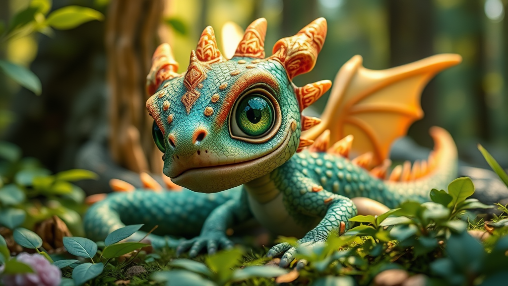 A whimsical baby dragon nestled in a lush forest, its large, enchanting green eyes reflecting the vibrant colors around. Its scales shimmer in a captivating palette of teal and gold, intricately detailed with a touch of sharpness, creating a mesmerizing contrast. The scene captures the essence of delicate fantasy, reminiscent of the intricate artistry found in the works of Paul Barson and Kadir Nelson. The close-up view reveals the dragon's features in astonishing detail, its skin textured with prickly, ornate designs, evoking a sense of magical realism. The play of light adds depth, casting dappled patterns across its form as it curiously explores the forest floor, surrounded by towering trees and soft, verdant foliage.