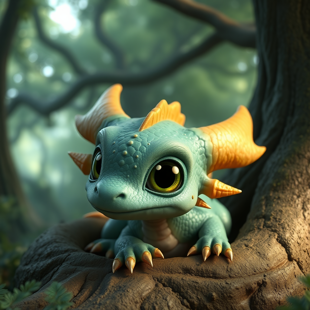 A whimsical baby dragon nestled in a lush forest with expansive trees, featuring large, captivating green eyes glistening with curiosity. Its skin shimmers in shades of teal and gold, with intricate, zbrush-style detailing that highlights the dragon's enchanting textures. Close-up perspectives reveal sharp, prickly features, reminiscent of imaginative illustrations by Paul Barson, with the elegance and vibrancy akin to Kadir Nelson's artistry. The overall atmosphere is mystical and immersive, with delicate touches enhancing the dragon's enchanting presence amidst the forest's natural splendor.