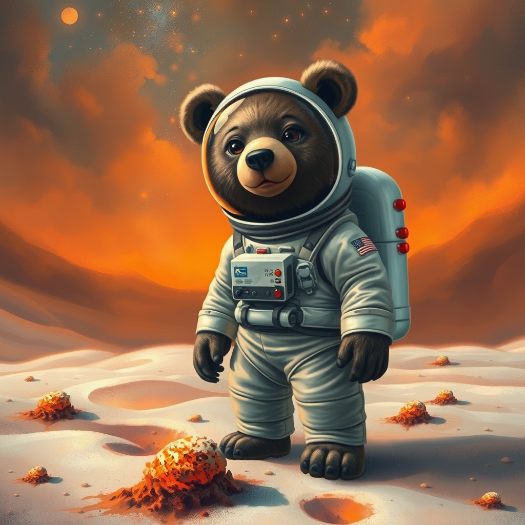A whimsical bear clad in a retro space suit stands on a mystical, otherworldly terrain, enveloped by iridescent sands of dark white and fiery dark orange hues. The scene is painted with a blend of fantasy art and poodlepunk, capturing the essence of a marine painter's dreamlike vision. The bear, with its eyes wide and inquisitive, exudes the charm and charisma of a character from a storybook. The composition is vibrant and detailed, reminiscent of a high-definition Flickr-style capture, immersing the viewer in this enchanting cosmic landscape.