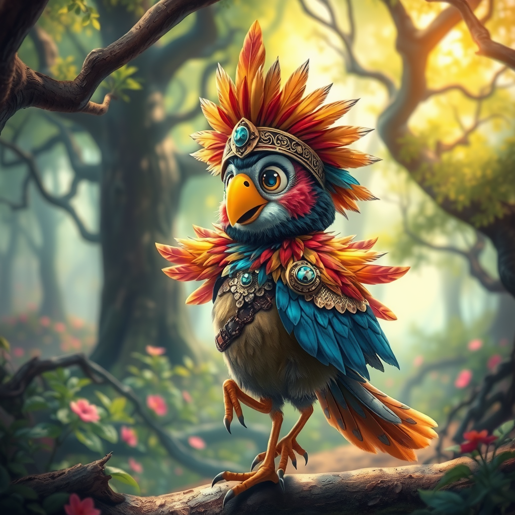 A whimsical bird adorned with radiant, multicolored feathers, sporting a feathered headpiece and a tribal helmet, its eyes brilliantly sparkling with a hint of mischief. The bird wears an elaborate lightweight armor crafted from delicate feathers, with intricate decorations reminiscent of an Animation Studio and Quentin Blake's imaginative style. It joyfully dances in a mystical forest, surrounded by captivating trees, their branches weaving through the enchanting landscape, creating a harmonious nature background enriched by the vibrant energy of the scene.
