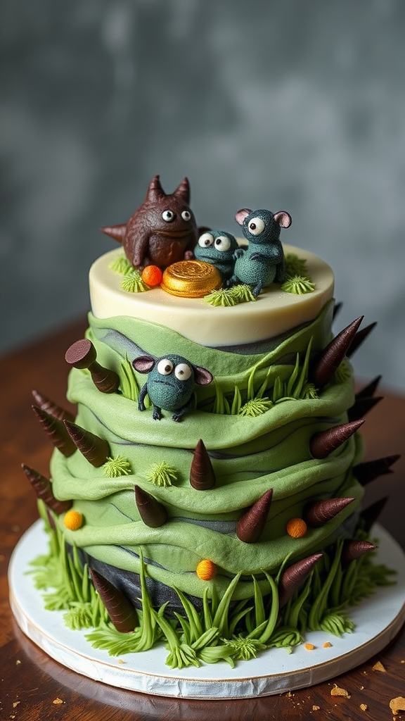 A whimsical cake design emerges, drawing inspiration from the mischievous critters movie. The cake stands as a playful homage, its layers resembling the rolling hills of the critters' countryside. Fondant creatures with gleaming eyes peek from behind tufts of edible grass, capturing their cheeky spirit. Edible chocolate spikes protrude playfully from the sides, mimicking the critters' distinctive appearance. The top of the cake features a clever scene: a group of critters gathered around a tiny candy treasure, their expressive faces sculpted with sugary detail. The overall feel is one of playful mischief, a deliciously eerie tribute to the beloved film.