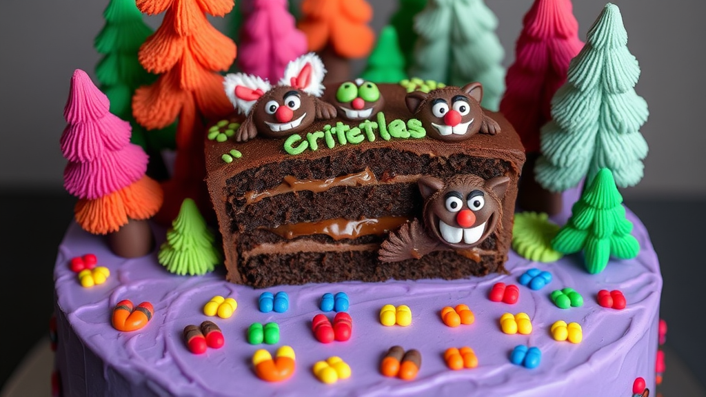 A whimsical cake inspired by the mischievous Critters movie, featuring chocolatey layers sculpted into playful, furry creatures with mischievous grins, surrounded by a vibrant forest of sugary trees and colorful edible critter footprints scattered across a velvety icing landscape.