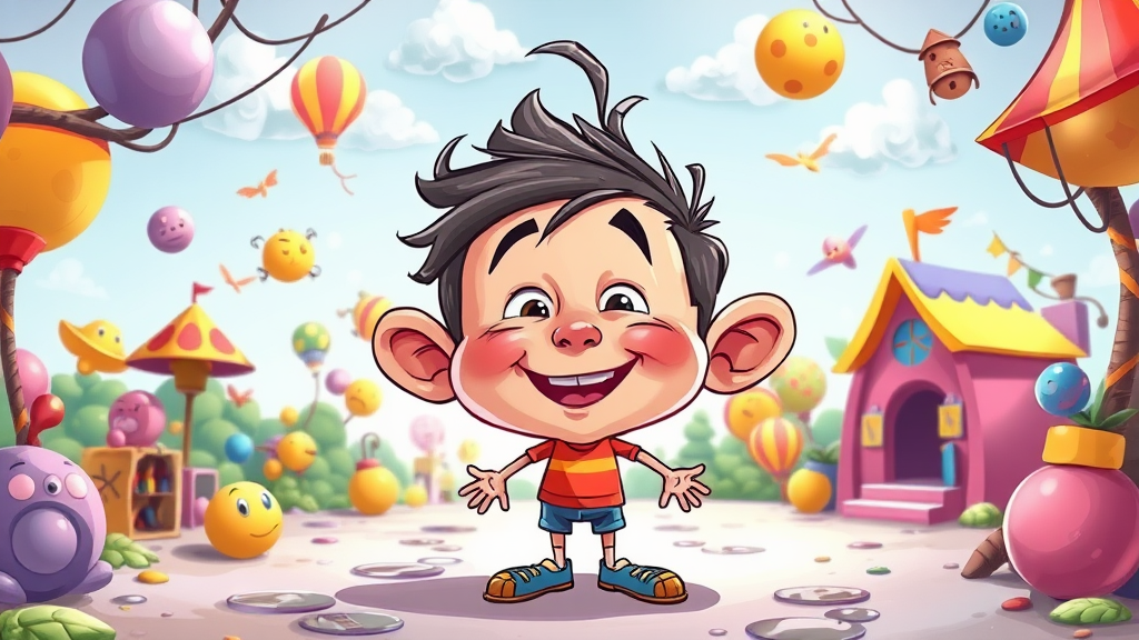 A whimsical caricature illustration of a children's comic book character with amusingly exaggerated features, such as an oversized head and tiny feet, set in a vibrant, colorful world with playful, fantastical elements, maintaining a childlike innocence and humor --ar 1:2 --stylize 750.