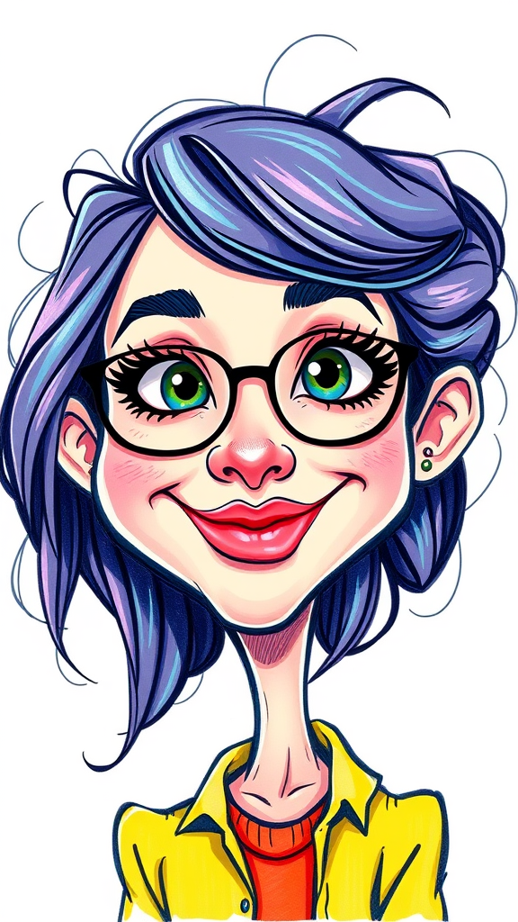 A whimsical caricature of a cute woman in her mid-20s, drawn with vibrant color pencils in a Pixar-inspired style. Her exaggerated features are hilariously funny, set against a clean white background. The composition has a playful chaos, with a tall 1:2 aspect ratio and a touch of artistic flair.