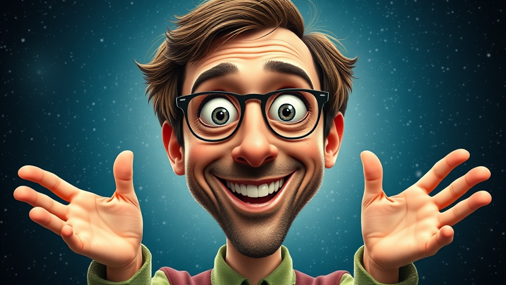 A whimsical caricature of Simon Helberg as Howard from The Big Bang Theory, capturing him with wide eyes and a beaming smile in the style of artists Sebastian Krüger and David Cowles. The artwork emphasizes intricate and detailed skin texture, set against a mesmerizing starscape background. The composition is centered with playful incorporation of text and hands reaching outward, creating a 3D effect that subtly breaks the frame. The overall portrait is a humorous and imaginative blend, spotlighting the character with elements that avoid low resolution or any deformed features, and ensuring focus remains singularly on a uniquely expressive depiction of Howard, bringing a joyful and vibrant essence to life while cleverly avoiding any depiction of ugliness or multiple faces.