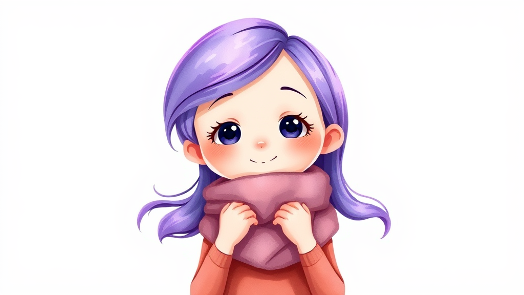 A whimsical cartoon character with vibrant purple hair, wearing a cozy scarf around her neck. She stands against a bright white background, exuding a sense of playful charm. The character's style is reminiscent of soft watercolors, bringing a gentle, artistic feel to her appearance. Her skin is perfectly smooth, with no blemishes or imperfections. She is enveloped in a subtle backlight that enhances her whimsical presence. Her features are distinctly human, with well-proportioned hands and fingers. The composition maintains clarity, avoiding any elements that could disrupt the harmonious look of the scene, such as extra limbs or unusual traits. The essence of a childlike wonder is captured, with a focus on simplicity and elegance.
