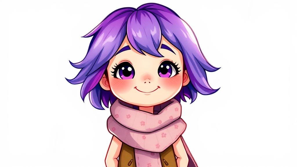 A whimsical cartoon character with vibrant purple hair and a cozy scarf wrapped around her neck stands confidently against a plain white background. Her appearance is vivacious and artistic, resembling a colorful watercolor painting or sketch. Despite her youthful charm, she has a few subtle skin features like freckles, adding character to her animated face. The lighting around her creates a gentle backlit glow, enhancing her bright purple hair and adding depth to her features without creating any distortion or exaggeration. Her hands and limbs are elegantly proportioned, retaining a classic cartoon simplicity with no unnecessary details. The focus is on her expressive eyes and joyful smile, evoking a sense of playful exploration and creativity.