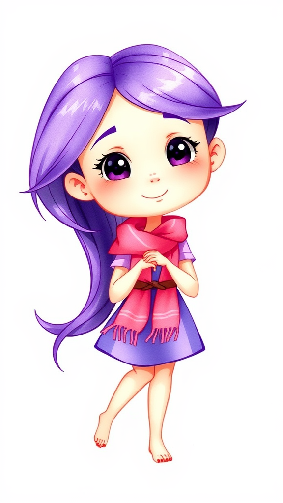 A whimsical cartoon character with vibrant purple hair flowing elegantly past her shoulders, adorned with a playful scarf draped around her neck. She stands confidently against a plain white background, exuding a charming aura. Her skin is smooth and clear, with a subtle watercolor texture, reminiscent of delicate paintings and sketches. The character's hands are gracefully shaped, each finger perfectly in place, contributing to her lively and adventurous persona. Her eyes sparkle with curiosity and wonder, while the soft lighting enhances her youthful glow. She moves with agility, her silhouette crisp and vivid, embodying a sense of vibrant energy and creativity.