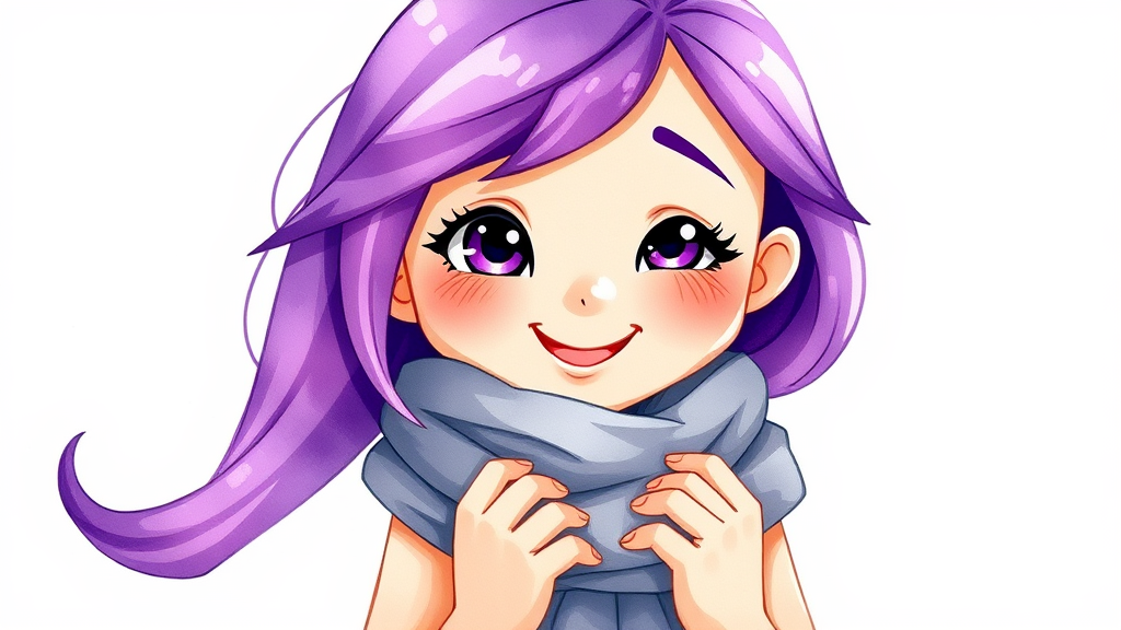 A whimsical cartoon character with vibrant purple hair cascading around her shoulders, a cozy scarf gently wrapped around her neck. Her lively expression is accentuated by a playful glimmer in her eyes. Created with a watercolor effect, the image captures a sense of artistic flair and charm against a clean white background. Despite the watercolor style, her features are distinct and crisp. She stands out with her smooth, youthful skin, and her frame is proportionate, avoiding any exaggerated or mutated features. Her hands gracefully hold the scarf, showcasing a regular number of fingers. Gentle shadows add depth without compromising the bright atmosphere. Bright and cheerful, the character exudes warmth and creativity, making her an engaging and memorable figure.