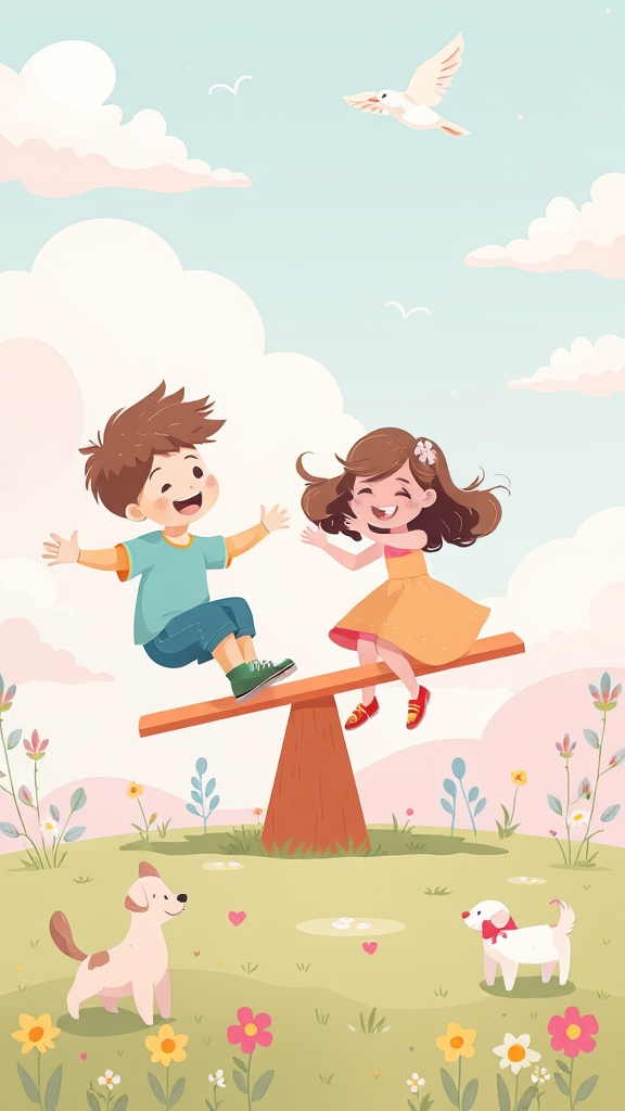 A whimsical children's book illustration featuring a boy and a girl joyfully playing on a seesaw amidst a dreamy pastel-colored playground. The scene is flat and 2D, with soft hues of pink, blue, and yellow creating a warm and inviting atmosphere. The background features fluffy clouds and birds swooping gracefully through the sky. Both children have bright, playful expressions, with their hair gently tousled by a light breeze. Nearby, a small, friendly dog watches them, wagging its tail, while colorful flowers dot the grassy ground.