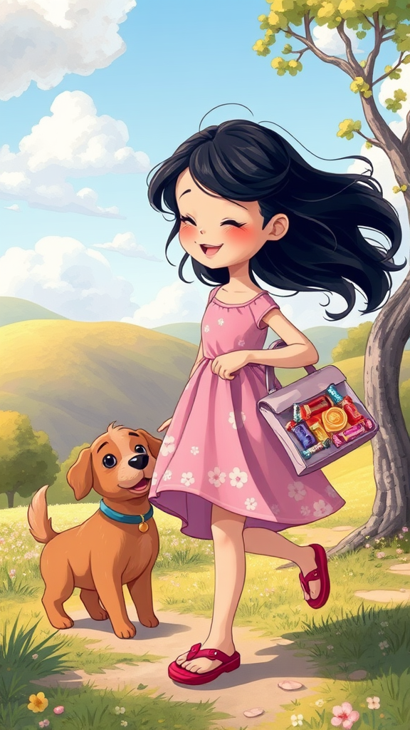 A whimsical children's book scene featuring a joyful young girl with flowing black hair, wearing a delightful pink dress adorned with floral patterns and playful sandals. She strolls along with her faithful dog companion, a charming pup with soft, curly brown fur and a wagging tail. In one hand, she holds a colorful bag filled with an assortment of candies, each wrapper sparkling in the gentle sunlight. The setting is awash with pastel colors, creating a dreamy, 2D landscape with rolling hills and fluffy clouds, where a gentle breeze tugs at her dress and rustles the leaves of nearby trees.