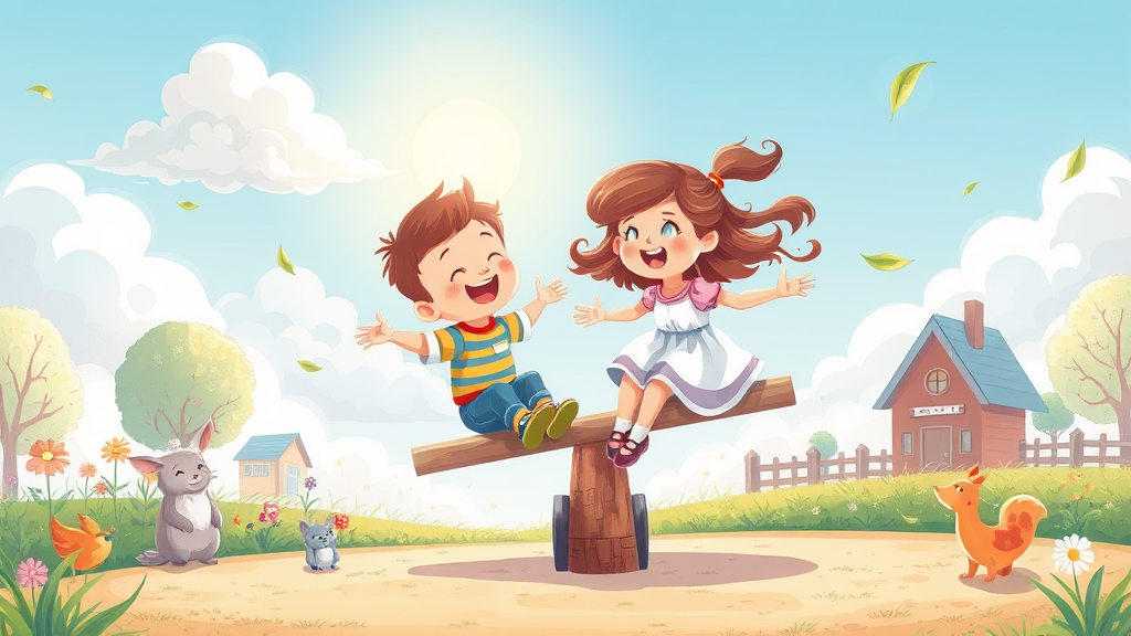 A whimsical children's book scene with a boy and a girl joyfully playing on a seesaw, surrounded by soft pastel colors. The illustration is in a charming 2D style, adding a playful touch to the artwork. The sun peeks through fluffy clouds, casting a gentle glow over a quaint park with colorful flowers and friendly animals watching the fun. The children are laughing, their hair blowing in the breeze, as a gentle gust moves a few scattered leaves. A sense of wonder and happiness fills the air, capturing the innocence and delight of childhood playtime.
