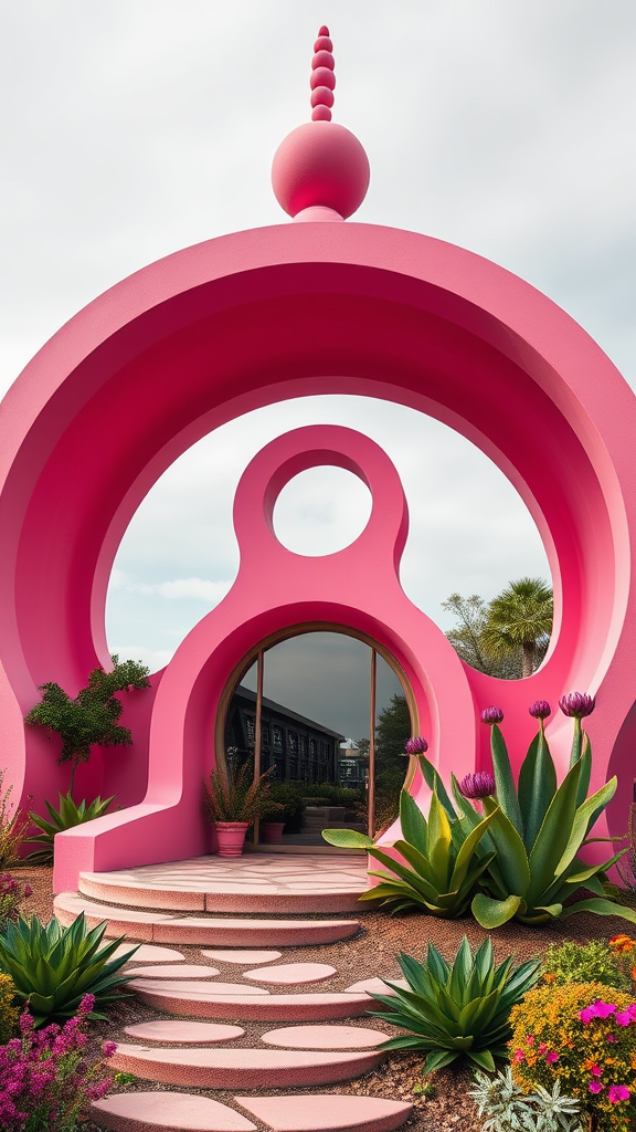 A whimsical circular pink structure with a central circular window, featuring vibrant pink arches and psychedelic architectural forms, this colorful biomorphic temple is nestled within a surreal garden. Influenced by Verner Panton and vegetal architecture, it exudes a pink zen style. This outdoor art installation showcases high-quality architectural artistry with its curving geometric arches crafted from pink concrete. The design presents an exquisite aesthetic, merging organic architecture with the creative vision of Lee Loughridge, resulting in a beautifully harmonious and imaginative creation.