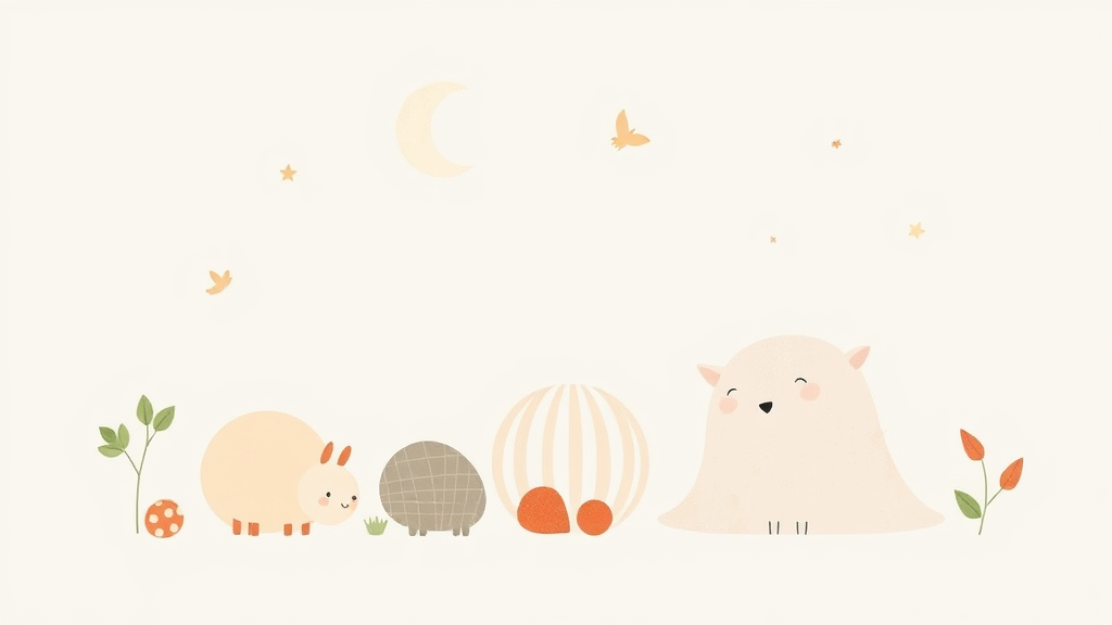 A whimsical clipart featuring organic shapes and creatures in the style reminiscent of Jon Klassen, using a soft and gentle pastel color palette that imparts a light and airy feel, suitable for nursery art. The composition is set against a clean white background, maintaining a soothing and playful aesthetic.