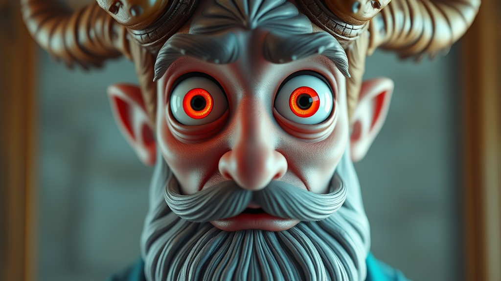A whimsical close-up portrait of a horned man with a beard, designed by an award-winning senior character artist and rendered using Unreal Engine 5. His bright, clear neon eyes, reminiscent of a Pixar character, are large and reflective, giving a playful and animated vibe. The character exhibits intricate details with cartoonishly exaggerated features, blending abstract and surreal elements. While the character's design showcases creative deformities, such as extra limbs or blurred anatomy, it retains an endearing charm similar to a toy figure. The portrait is a mix of clear focus and deliberate blurriness, resulting in a framed masterpiece with odd, oversaturated hues. Despite displaying a playful quality, the piece embraces a low-resolution, unfinished style, including elements like text or logos, offering an abstract, dreamlike quality that feels hand-sketched on paper, exuding a quirky CGI aesthetic.