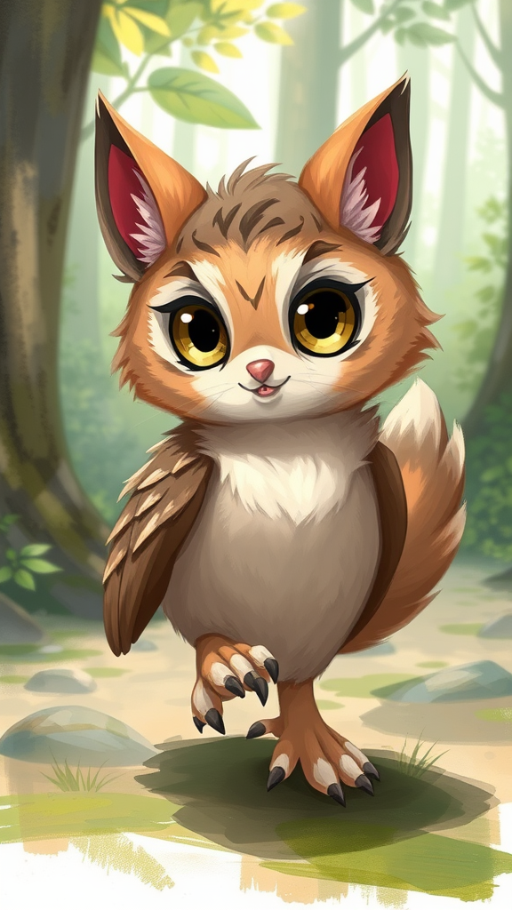 A whimsical creature blending the features of an owl and a cat, with large, expressive eyes and tufted ears. Its plumage is a mix of soft feathers and sleek fur, showcasing a palette of earthy browns and soft grays. The owl cat strikes a playful and dynamic pose, capturing a sense of motion, while its bushy tail swishes gracefully behind. Its wide, curious eyes give it a charmingly innocent expression. This anime-inspired 2D painting depicts the creature in a portrait style, highlighting its unique characteristics and magical allure against a serene woodland backdrop, emphasizing an expressive art style with vibrant, fluid brushstrokes.