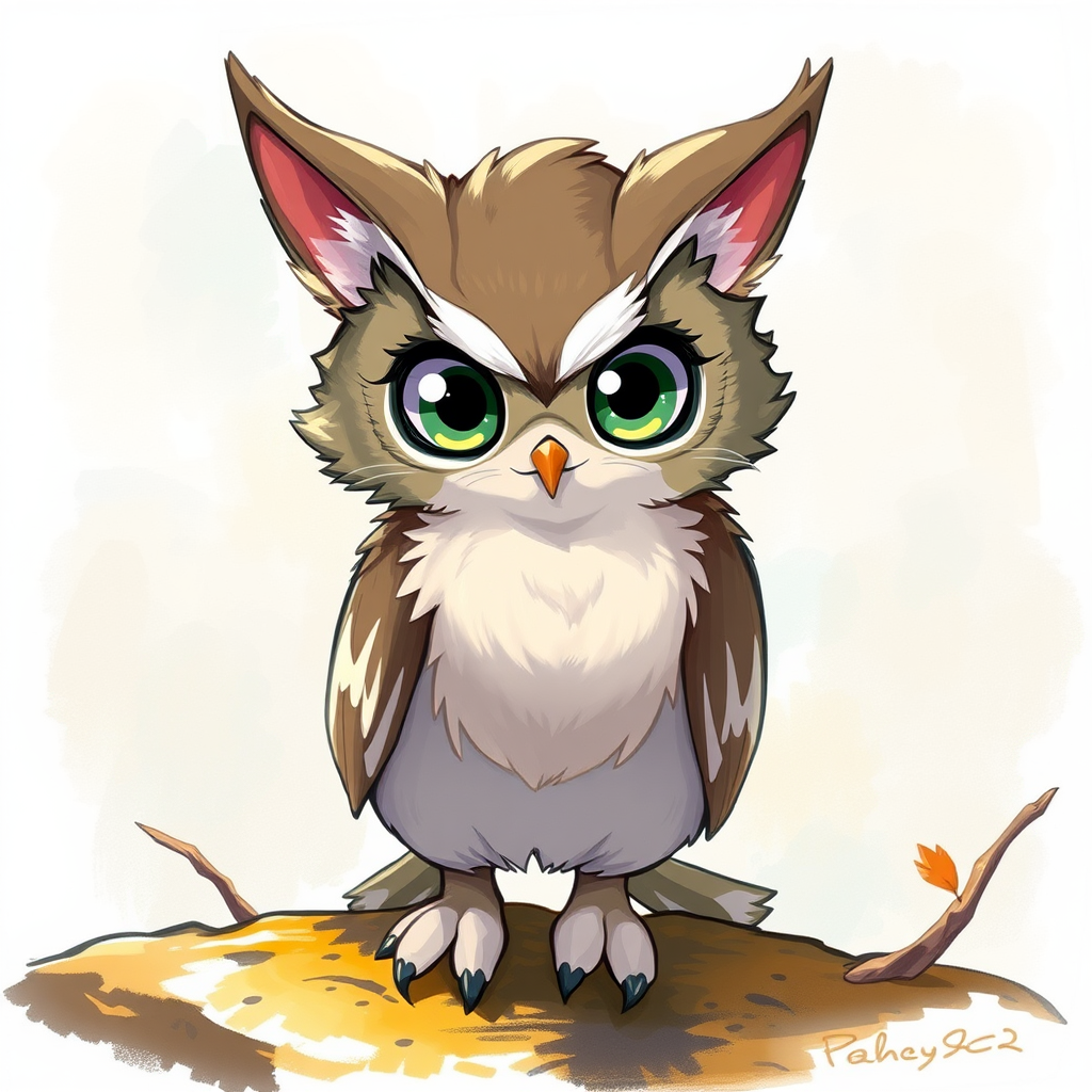 A whimsical creature with the grace of an owl and the playfulness of a cat; a charming owl-cat hybrid with feathered ears and large, luminous eyes. Its body is sleek yet fluffy, with a blend of soft fur and delicate feathers. Perched in an animated, lively pose as if ready to pounce or take flight, this delightful character captures the essence of both animals. Set against a fantastical backdrop, the scene is painted in a vibrant anime-inspired style, with expressive brushstrokes and rich colors. The overall composition maintains an engaging and dynamic quality, perfectly balancing the creature's dual nature.