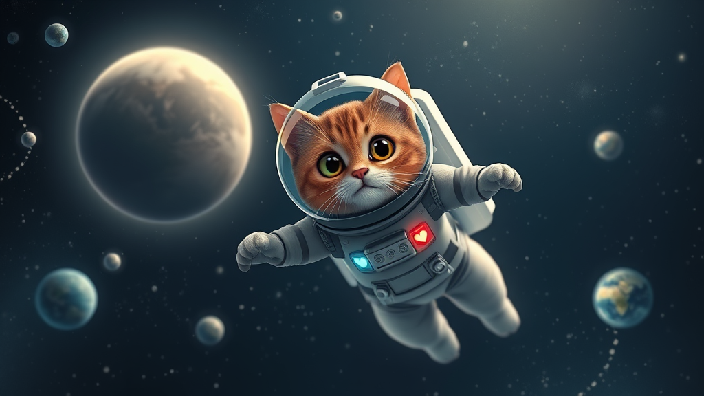 A whimsical depiction of a cat in a space suit floating amidst the stars, with Earth glowing softly in the distance. The cat’s face shows a mix of curiosity and adventure, its eyes wide as it navigates the cosmic expanse. Surrounding the feline astronaut are shimmering planets and distant galaxies, their colors vibrant against the dark backdrop of space. The space suit is sleek and modern, accentuated with glowing patches that pulse gently like a heartbeat. This scene captures the enchanting essence of a cat’s journey into the unknown, blending a sense of playfulness with the grandeur of outer space.