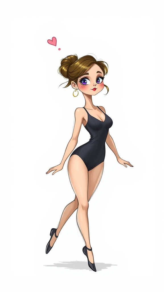 A whimsical depiction of a woman in a leotard on a plain white background, inspired by Evalyn_noexist and AshleyCipher art styles. The image combines sketch, illustration, and 3D elements, creating a playful and cartoon-like atmosphere. The woman has exaggerated, animated features with vibrant makeup, and the scene includes artistic duplicates adding a sense of movement. The figure is creatively rendered with a hint of deformation for artistic effect, and a touch of childlike wonder, balancing between reality and imaginative depiction. The composition, while abstract and playful, maintains an engaging and visually appealing balance.