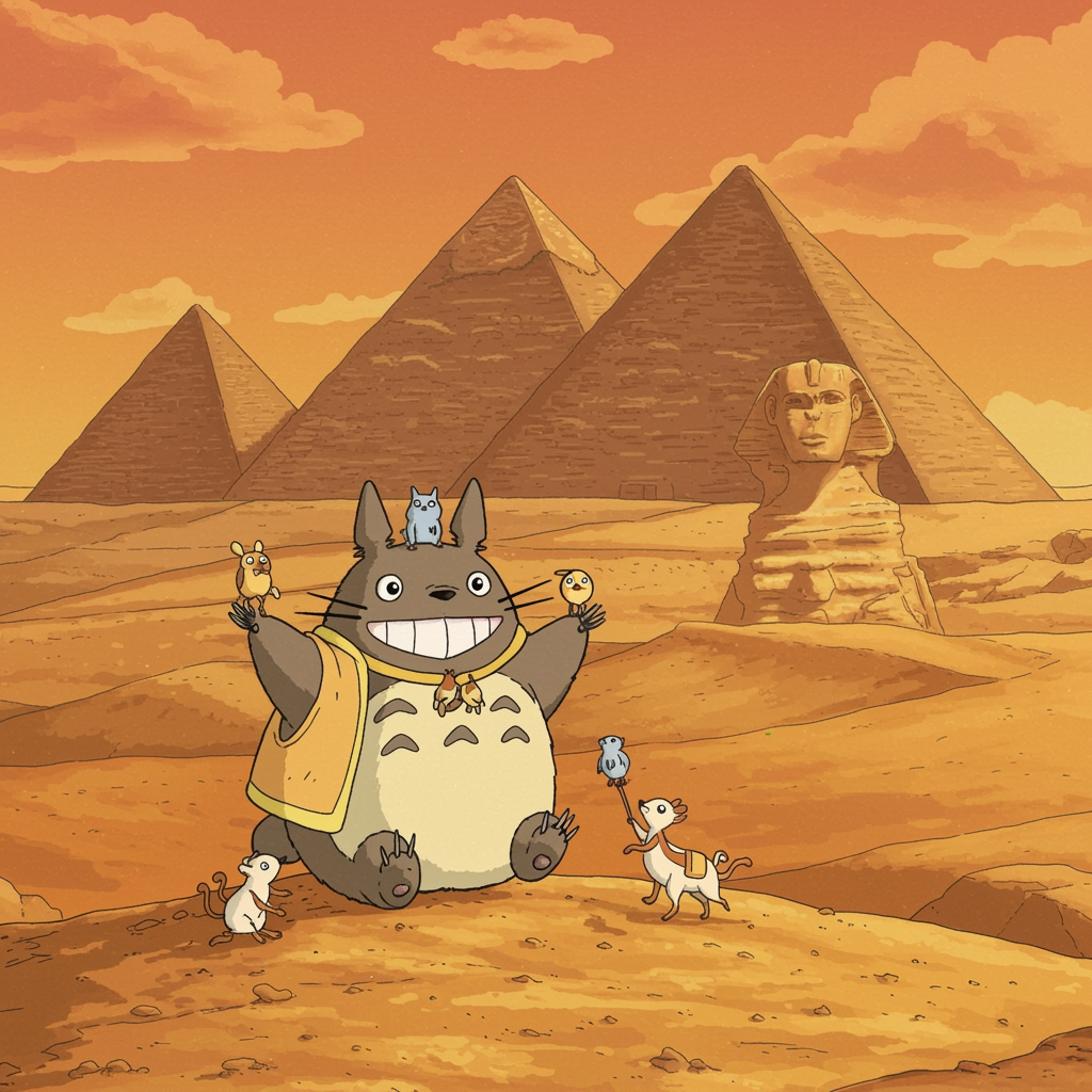 A whimsical depiction of Totoro exploring the ancient pyramids of Giza, with the majestic structures towering under a dusky orange sky. Totoro, adorned with a light shawl, is joyously interacting with small desert animals native to Egypt, while the great sphinx watches in the background. The scene captures an enchanting blend of timeless wonder and cultural fusion, infused with a warm, dreamlike aura.