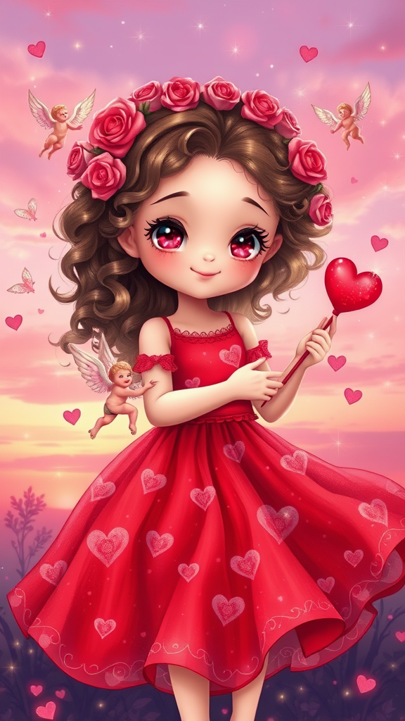 A whimsical depiction of Valentine's Day personified as a cute girl, adorned in a flowing crimson dress adorned with heart motifs. Her eyes sparkle like rose quartz, and curly, radiant hair cascades down her shoulders, interwoven with tiny red and pink roses. She holds a delicate heart-shaped wand, casting an aura of warmth and affection. Her presence is surrounded by fluttering, iridescent cupids, and the air around her shimmers with a soft, rosy glow, evoking an enchanting, romantic aura. The scene is set against a dreamy sunset sky, painted in hues of pink and lavender, with hints of glittering stars peeking through, adding to the magical ambiance.