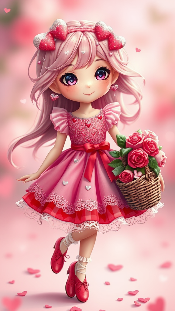 A whimsical depiction of Valentine's Day personified as a charming girl with a playful spirit; she has soft, flowing hair adorned with delicate heart-shaped accessories. Her dress is a blend of vibrant pinks and reds, embellished with intricate lace and tiny shimmering hearts. Her eyes sparkle like the sweetest candies, conveying warmth and affection. She carries a basket filled with roses and love notes, spreading joy wherever she goes. Her presence exudes an aura of romance, enchantment, and the tender joy that defines the holiday. The background is a blur of pastel hues, evoking a dreamy, romantic ambiance.