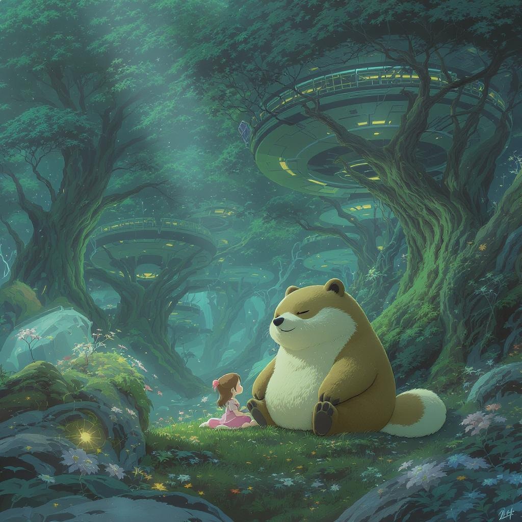 A whimsical digital 2D scene in the enchanting style of Miyazaki, featuring an ultimate detailed and dreamy landscape. The setting is a futuristic, sci-fi-inspired mystical wilderness, abundant with intricate, multilayered round architecture perched in the treetops. The architecture is both simple and advanced, creating a gentle contrast with the sprawling natural environment. Nestled within this charming habitat is a small and adorable girl, living peacefully alongside her plushified, friendly giant tanuki. The scene is bathed in dramatic, soft lighting that highlights the tender relationship between the girl and her companion. Utilizing the rule of thirds, this cinematic tableau captures the essence of solitude and companionship amidst the grandeur of nature, reflecting a magical world where technology and wilderness coexist harmoniously.