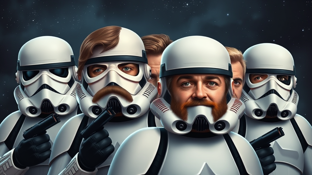 A whimsical digital art piece portraying famous Hollywood celebrities as stormtroopers from the Star Wars universe, effortlessly blending their recognizable facial features and expressions with the iconic armor. Set against a moody, cosmic backdrop, the composition radiates a sense of humor and satire, celebrating geek culture. Familiar actors and actresses, sporting cheeky grins and playful eyes, bring a humorous twist to the scene, capturing both the allure of Hollywood and the nostalgic charm of the Star Wars saga.