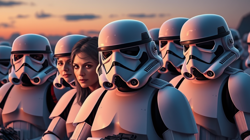 A whimsical digital art piece showcasing Hollywood celebrities transformed into stormtroopers, adorned in the classic Star Wars armor. The scene features a blend of famous actors and actresses, their recognizable facial features and expressions subtly visible beneath the helmets. Set against a moody, twilight background, the composition exudes a playful yet satirical tone, celebrating geek culture with a humorous twist.