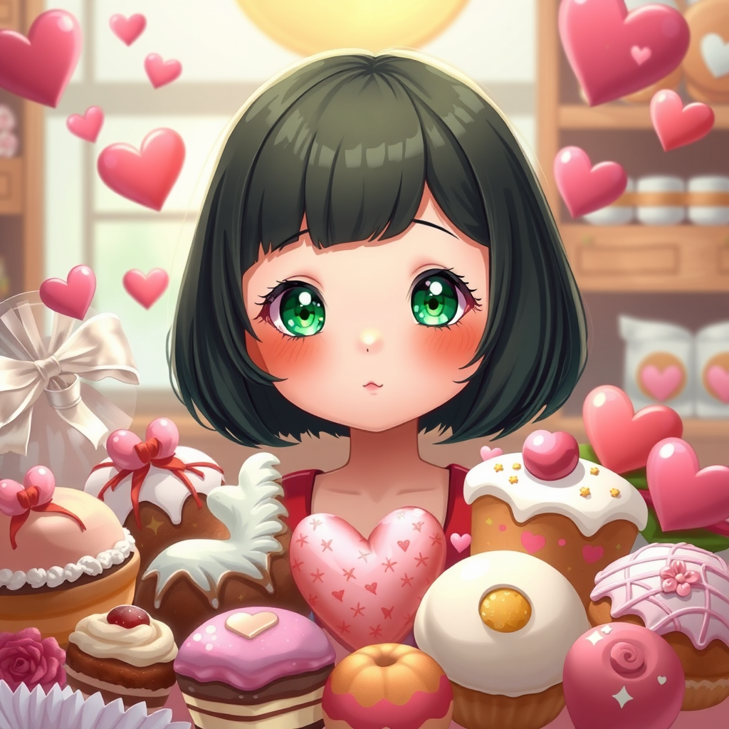 A whimsical digital illustration depicting the personification of Valentine's Day as an adorable girl with a short bob haircut, her emerald eyes sparkling with warmth and charm. In the style of an Artgerm masterpiece, the artwork blends the enchanting aesthetic of Studio Ghibli with the detailed finesse admired on ArtStation. This delightful figure is surrounded by an array of delectable sweets and pastries, reminiscent of a quaint bakery, capturing the essence of love and indulgence. The piece, influenced by Alexei Vinogradov's style, presents a harmonious blend of vivid colors and sharp focus, evoking a sense of dreamy wonder.