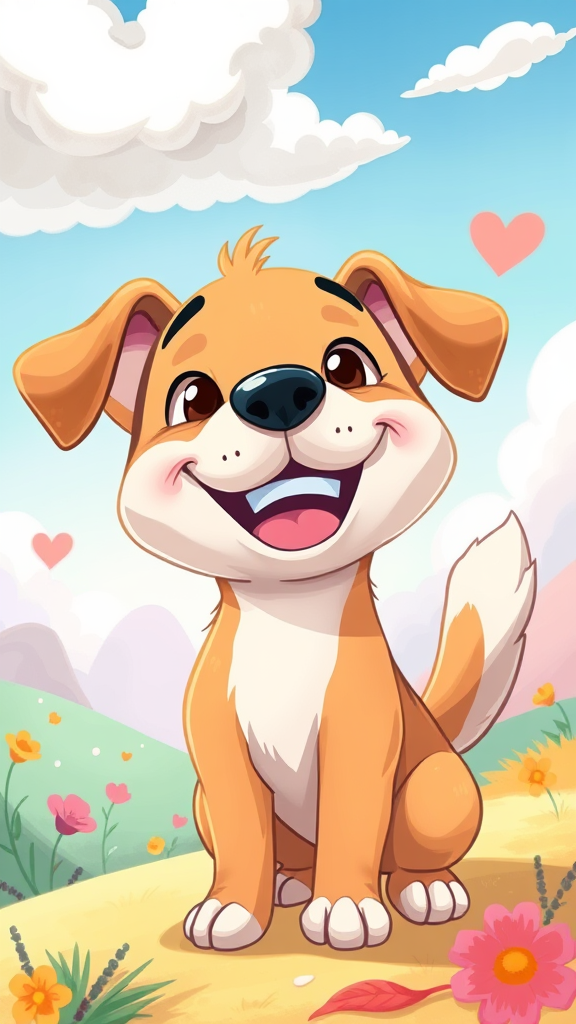 A whimsical digital illustration featuring an adorable cartoon dog grinning joyfully at the viewer, with big expressive eyes and a playful, wagging tail, surrounded by a colorful, dreamy landscape that enhances its charming personality.