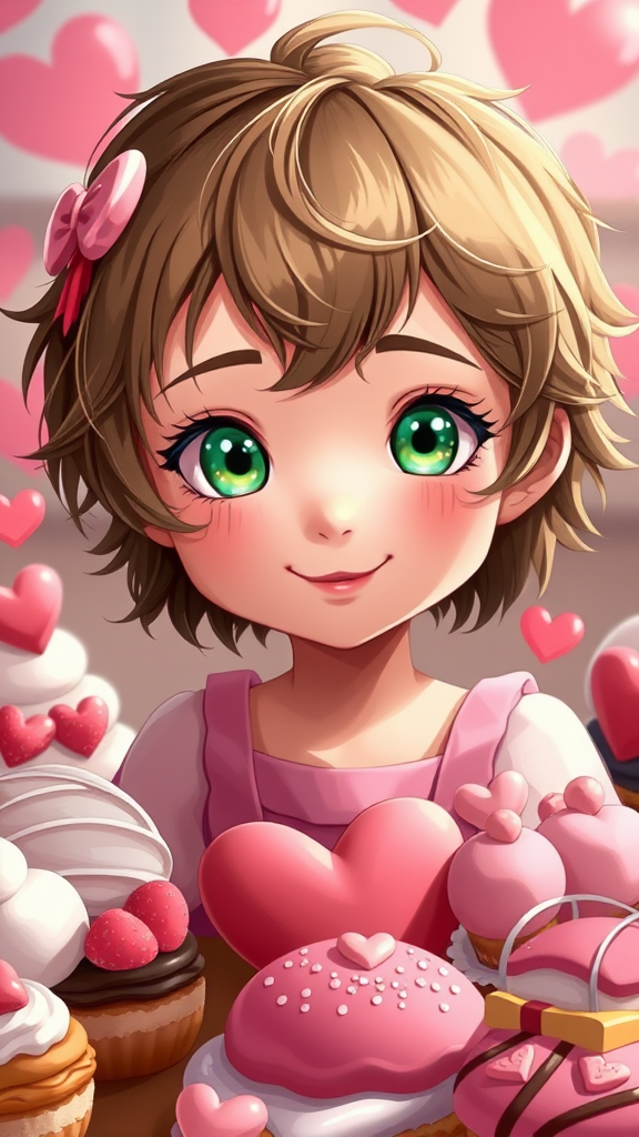 A whimsical digital illustration of the personification of Valentine's Day as an enchanting young girl with short, tousled hair, crafted in the signature style of Artgerm, blending the charm of Studio Ghibli with the artistic flair of DeviantArt. She boasts striking emerald eyes and a captivating smile, surrounded by a delightful array of bakery sweets and confections. This highly detailed artwork captures her in sharp focus, reminiscent of Artstation pieces, with a touch of magic brought to life by the creativity of Alexei Vinogradov.