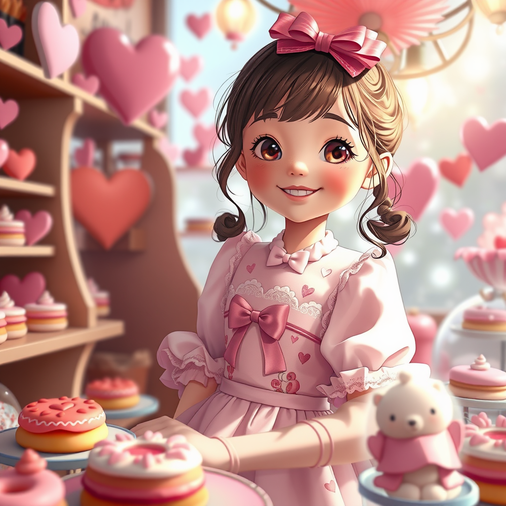 A whimsical digital illustration of the Valentine's Day holiday personified as a charming young girl, set in a magical bakery filled with heart-shaped pastries and pink-hued decorations, unreal engine rendering showcasing high attention to details, blending Artgerm's dynamic style with the enchanting atmosphere of Studio Ghibli, featuring her in a pastel-colored ensemble adorned with romantic motifs, surrounded by an ethereal glow, sharp focus capturing her joyful expression, reminiscent of the vivid galleries on DeviantArt and ArtStation, crafted by Alexei Vinogradov, exuding a sense of warmth and love.