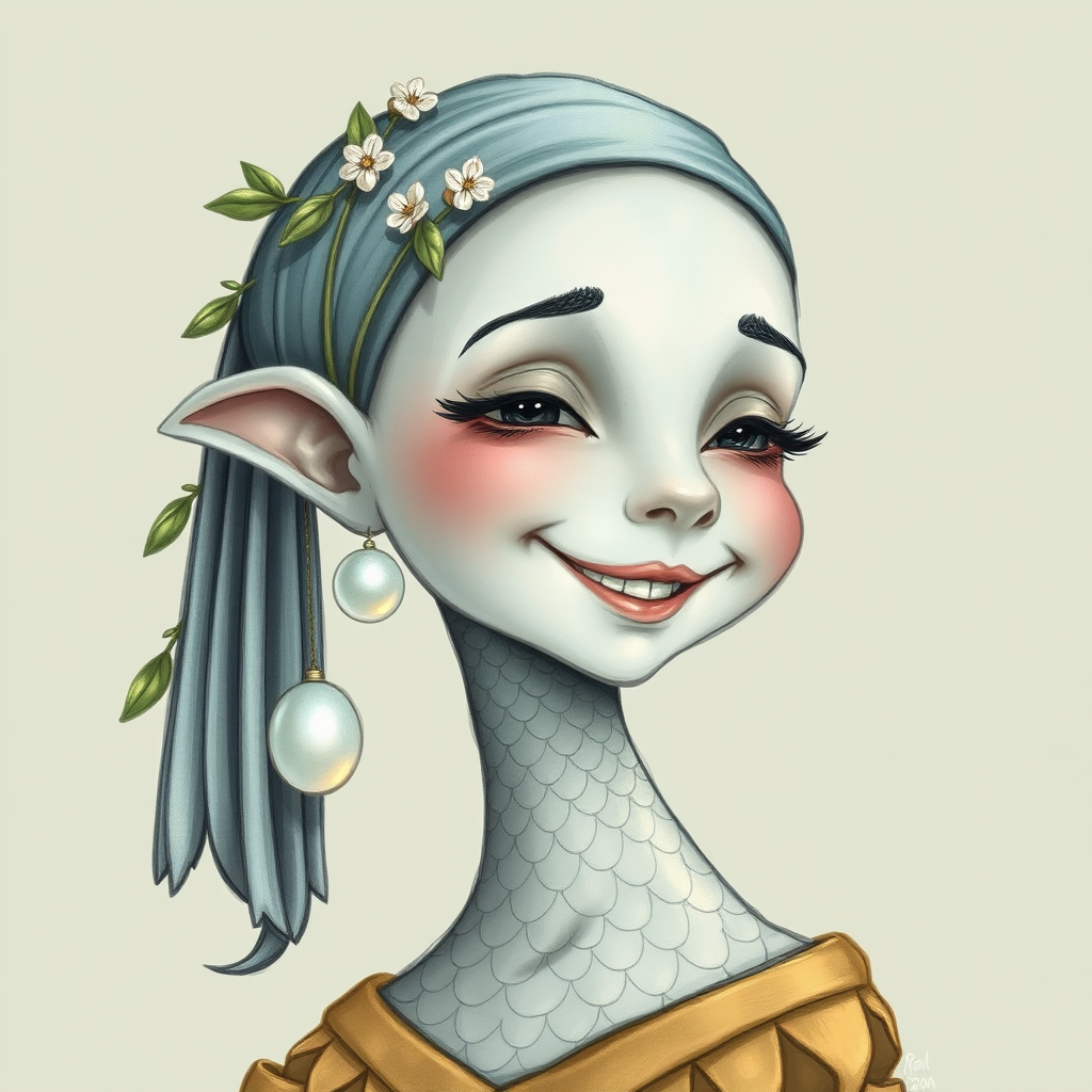 A whimsical drawing of a cryptid resembling a woman with a pearl earring, her features softly anthropomorphic and endearing. Her smile is joyful and content, her eyes sparkling with mirth. Delicate scales shimmer subtly across her skin, blending harmoniously with her human-like features. The pearl earring gleams under the light, complementing her elegant, slightly elongated ears. Her hair cascades like flowing water, interwoven with leaves and tiny blossoms. Her posture is meticulous, exuding grace and mystery, as if captured in the midst of a gentle laugh amidst an enchanted forest.