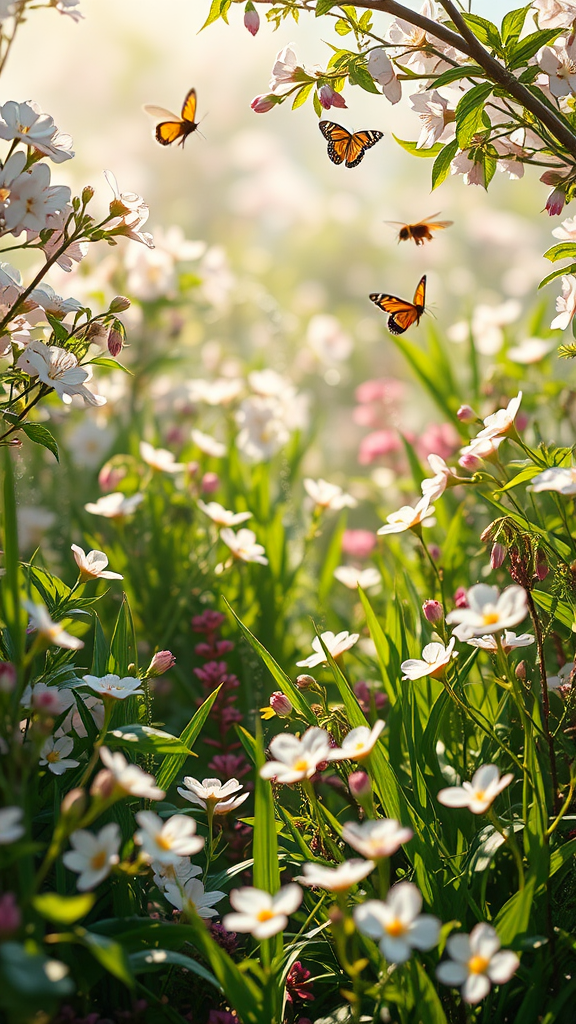 A whimsical embodiment of springtime emerges, captivating and radiant, surrounded by a lush tapestry of blooming flowers and vibrant greenery. The air is filled with the delicate fragrance of blossoms and the gentle hum of bees and butterflies fluttering about. This spirit of renewal and growth is gracefully intertwined with the landscape, bringing life and color to every corner. Soft sunlight filters through the newly sprouted leaves, casting playful shadows and illuminating the delicate, dewy petals. The scene exudes a sense of enchantment and vitality, inviting all to revel in the joy and rejuvenation that springtime brings.