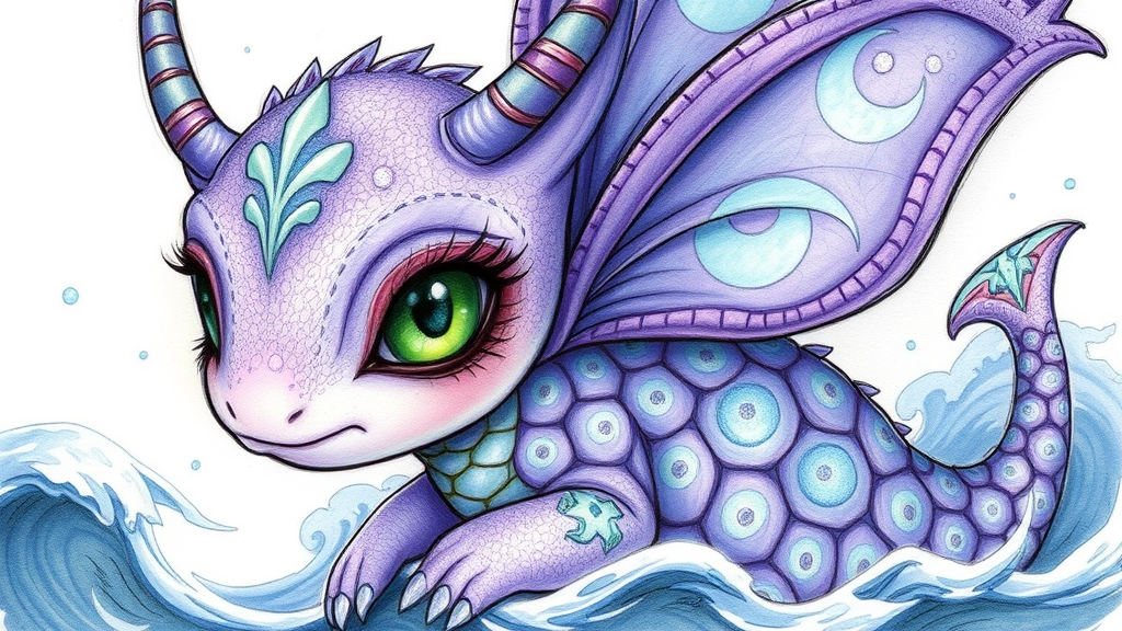 A whimsical fae with emerald eyes and shimmering lavender scales adorned with enchanting crescent moon patterns, set against a backdrop of mysterious, mystical waves. The captivating creature is depicted in the style of Darwyn Cooke illustrations, capturing its magical aura in an exquisite sketch drawing. The scene is infused with a sense of wonder and fantasy, bringing the fae's ethereal beauty to life in an 800x800 resolution artwork.