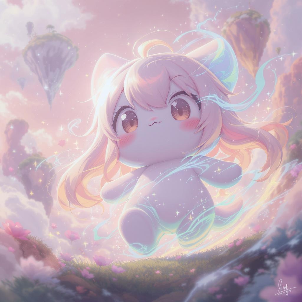 A whimsical fairytale scene where a charming anime mascot transforms into delightful, pastel shades, merging beautifully with a gentle pastel palette, exuding happiness and delight. The scene is bathed in warm, soft light, evoking a sense of wonder. Inspired by Bryan Hitch, the mascot is captured from a low angle, gazing directly at the camera, accented by a playful lens flare against the enchanting backdrop of a magical landscape.