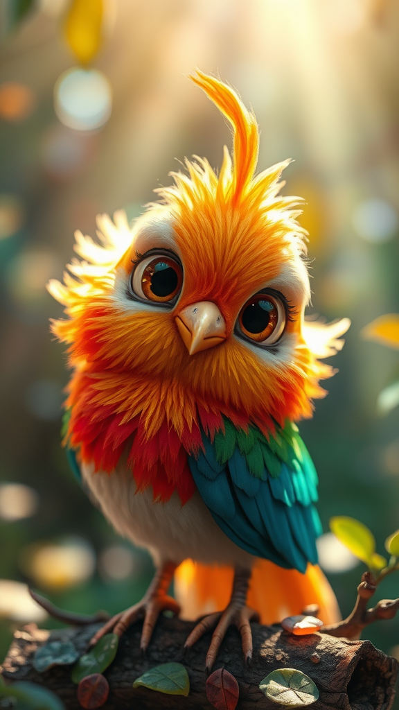 A whimsical fantasy bird with vibrant plumage, its eyes large and filled with playful curiosity, each feather intricately detailed and shimmering under ethereal fairy lighting. The scene is bathed in a spectrum of bright colors, with photorealistic textures capturing every nuance of its innocent demeanor. Volumetric rays of light cascade around, enhancing the magical atmosphere, and high dynamic range highlights accentuate the delicate contrasts and luminous quality of the setting.