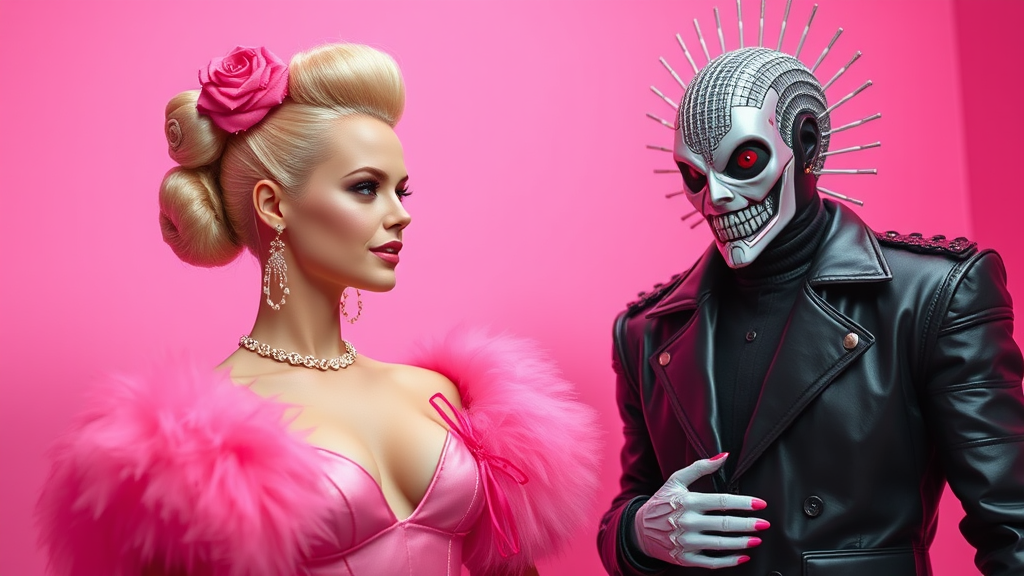 A whimsical fusion of cinematic universes unfolds as Margot Robbie channels Barbie's iconic charm in a surreal encounter with Hellraiser's enigmatic Pinhead, both set against a vibrant pink backdrop. Robbie, adorned in a glamorous pink ensemble, exudes elegance and poise while standing in contrast to Pinhead's eerie presence, clad in his signature leather attire. The scene is a playful yet haunting tableau, blending charm and mystery, as a surreal pink atmosphere envelops the characters, highlighting the intriguing juxtaposition of lighthearted glamour and dark allure.
