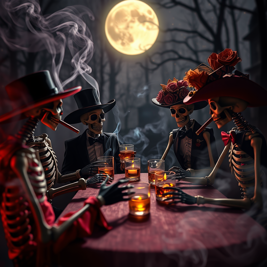 A whimsical gathering of Día de Muertos skeletons plays cards in a moonlit cemetery, surrounded by swirling cigar smoke and whisky glasses glistening in the dim light. The scene, reminiscent of a Tim Burton film, captures the essence of Mexican Day of the Dead with vivid colors and an eerie, moody atmosphere. Calaveras and elegantly dressed Catrinas partake in a high-stakes poker game under a canopy of twinkling stars. The cinematic composition is in ultra-sharp focus, with a beautiful bokeh effect enhancing the depth and mystery of the setting. The visual experience is rendered in UHD with HDR10 clarity and an astonishing 16K resolution, capturing every intricate detail with absurd realism. The image is seamless and free from distractions like borders, artifacts, or overlays, offering a pure and immersive glimpse into this enchanting, otherworldly scene.