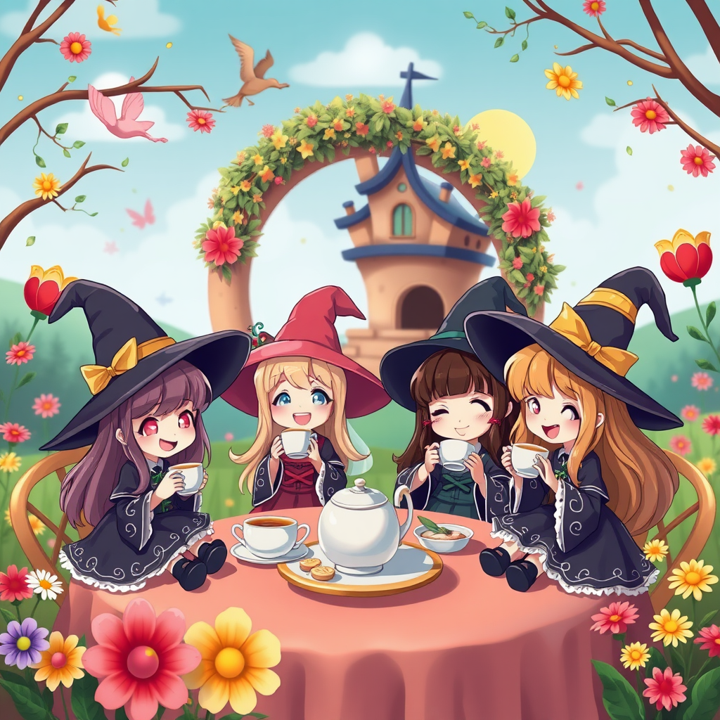 A whimsical gathering unfolds with joyful chibi witches sipping tea in a vibrant and colorful setting, exuding happiness and cute charm as they celebrate their enchanting tea party amidst a masterpiece of lively and picturesque surroundings.
