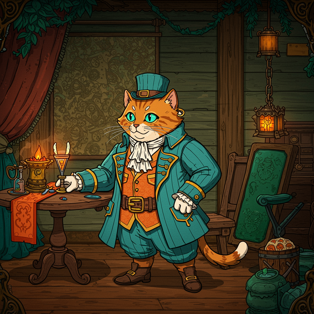 A whimsical gentleman cat illustration, rendered in a 2D game art style with a vibrant cyan and orange color palette, set in a 32k UHD resolution. The scene exudes a necropunk aesthetic, with intricate tapestries and wood textures enhancing the background. The cat, adorned in elaborate attire, emanates fancy vibes amidst its surroundings. Subtle creative twists add a touch of chaos and unpredictability to the design, while maintaining an aspect ratio of 2:3, enriching the playful and fantastical essence of the artwork.