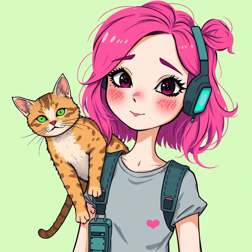 A whimsical girl with vibrant pink hair, her quirky personality shining through as she stands with a playful cat perched on her shoulder. She is adorned with charming freckles, drawn with flat shading reminiscent of Gemma Correll’s distinctive style. The illustration blends cyberpunk elements with photo-manipulated details, featuring a pastel green backdrop that adds a modern, futuristic flair. Her attire incorporates subtle tech-inspired accents, merging with the playful, light-hearted theme.