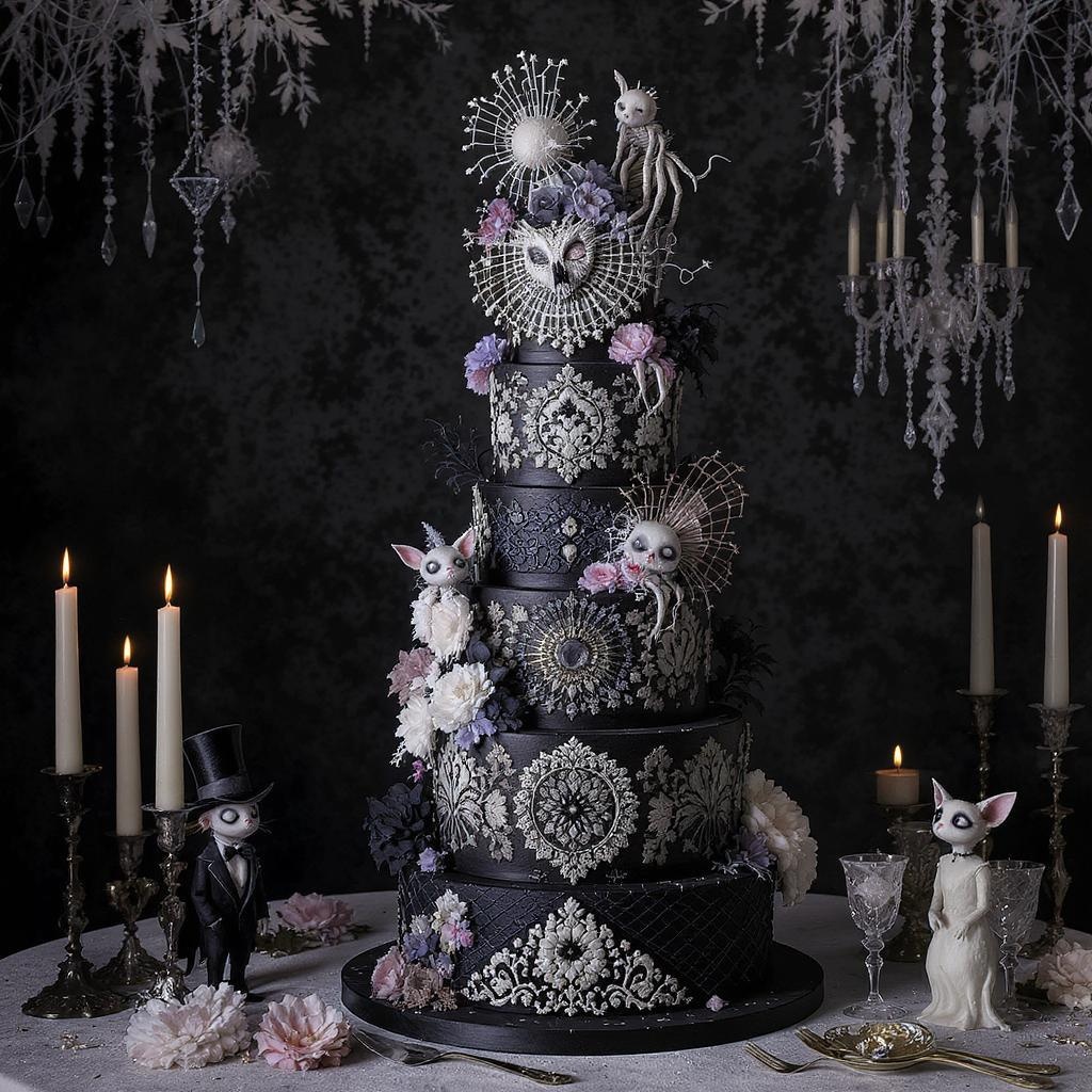 A whimsical, gothic-inspired wedding cake designed with Tim Burton's unique aesthetic in mind, featuring intricate black and white patterns, quirky, offbeat decorations, and a dash of elegant eeriness. The cake stands tall with tiers that defy gravity and possess an otherworldly charm, surrounded by delicate, surreal flourishes and fantastical characters that bring a touch of dark fantasy to the scene. The overall presentation is a perfect blend of the macabre and the romantic, enchanting guests with its dreamlike quality.
