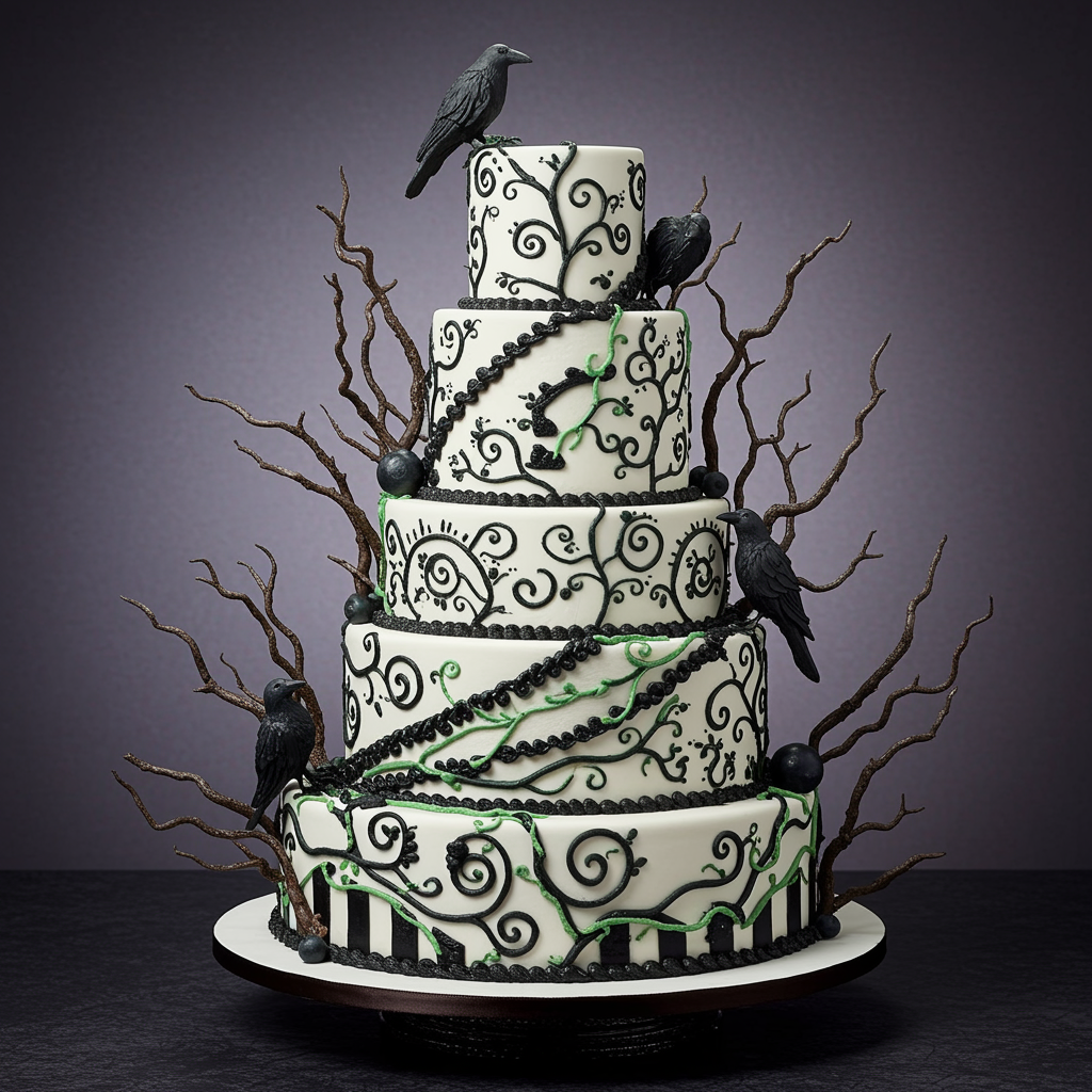 A whimsical, gothic-themed wedding cake inspired by Tim Burton, featuring spiraling layers adorned with intricate black and white patterns, hints of deep purple and eerie green accents, with twisted, vine-like flourishes, and quirky, asymmetrical tiers that defy the ordinary. Delicate, dark chocolate ravens are perched along the edges, adding an air of mystery and enchantment, while gnarled sugar branches wrap around the cake, creating an otherworldly, fantastical charm.