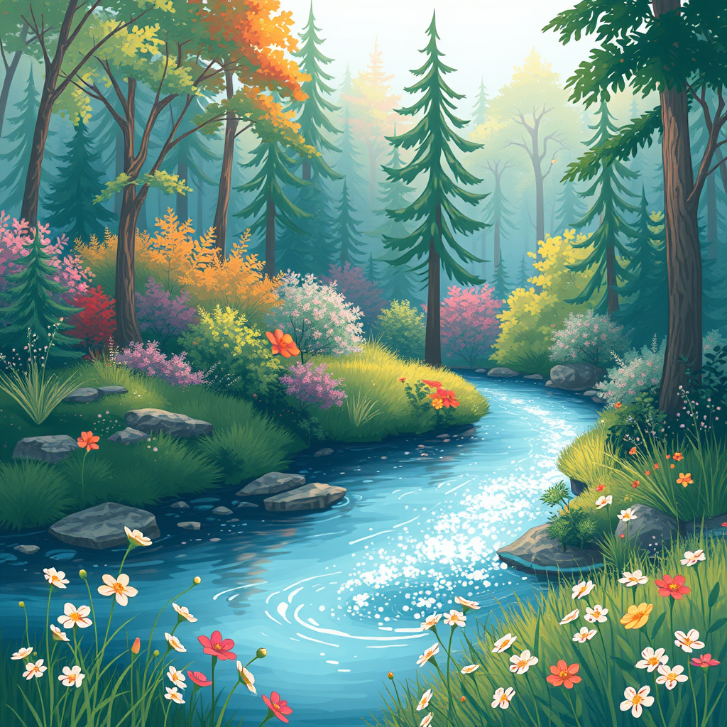 A whimsical illustration depicts a serene landscape, with a kaleidoscope of colors adorning the lush, wooded background. In the foreground, a gentle river winds gracefully, its waters sparkling under the soft glow of sunlight. The scene exudes a fairy tale charm, inviting tranquility and a sense of peace to all who gaze upon it. Delicate wildflowers pepper the riverbanks, adding a touch of vibrant whimsy to the enchanting scenery.