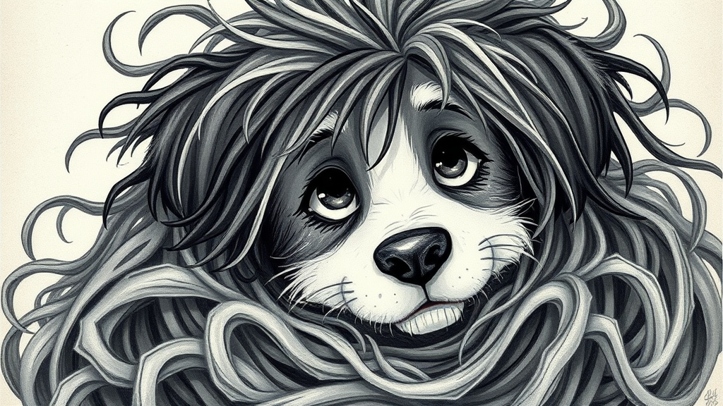 A whimsical illustration of a dog with unruly, tousled hair, captured in the enchanting style of a children's book. The scene evokes the grainy quality of vintage black and white photographs, blending the emotional depth of Doug Hyde's work and the expressive nuances reminiscent of Wilhelmina Weber Furlong. The dog's face is rich with emotional expression, surrounded by a chaotic nest of tangled hair, evoking a sense of playful mischief. The texture is rough and tactile, drawing the viewer into its whimsical charm.