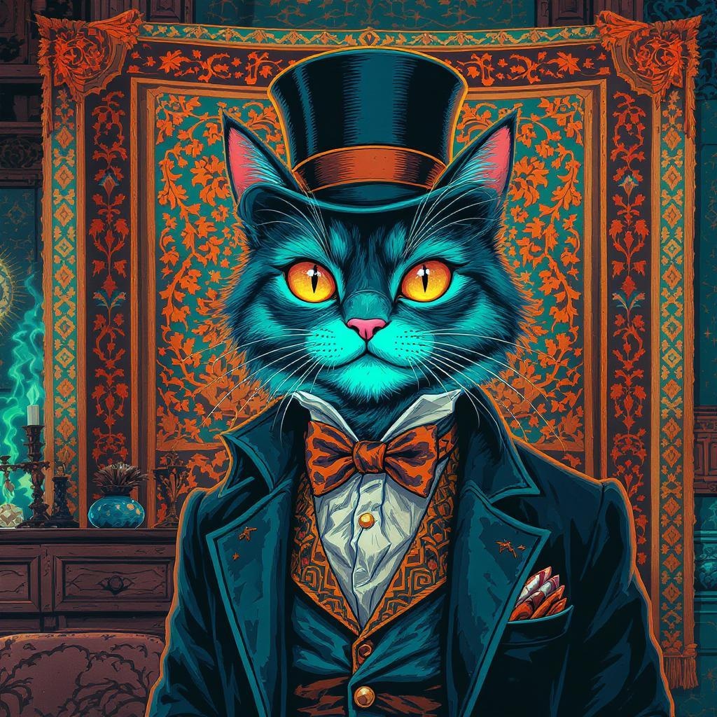 A whimsical illustration of a gentleman cat, depicted in 2D game art style with a palette of cyan and orange hues, presented in ultra-high-definition. The scene exudes a necropunk atmosphere, incorporating elements of tapestries and intricate woodwork. The cat, clad in fancy attire, embodies an air of sophistication with a touch of the fantastical. The background showcases an elaborate tapestry design and wooden textures, adding to the elegant vibe. The style is playful yet refined, capturing the essence of a whimsical and otherworldly setting, with a creative twist on classic elegance.